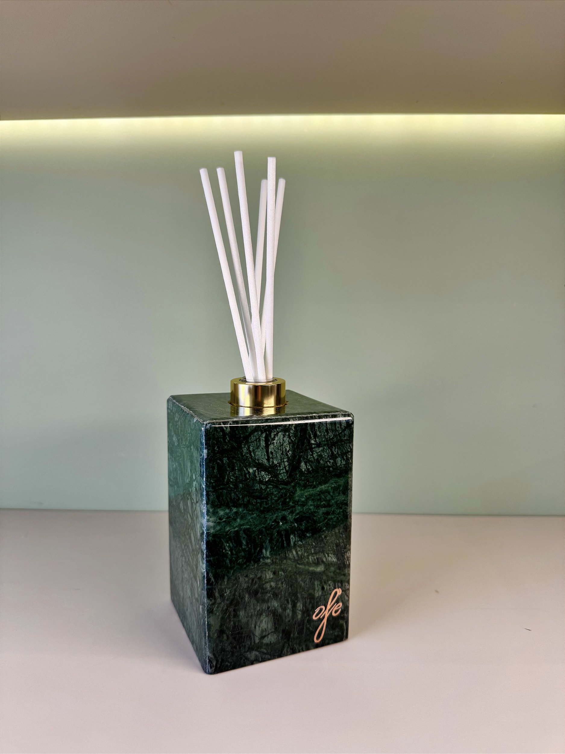 O difusor Pietra é uma escultura funcional: um recipiente em mármore Verde Guatemala, cuidadosamente talhado à mão para revelar suas veias, poros e tonalidades únicas. Cada peça é diferente — uma expressão da força e da imperfeição perfeita da natureza.